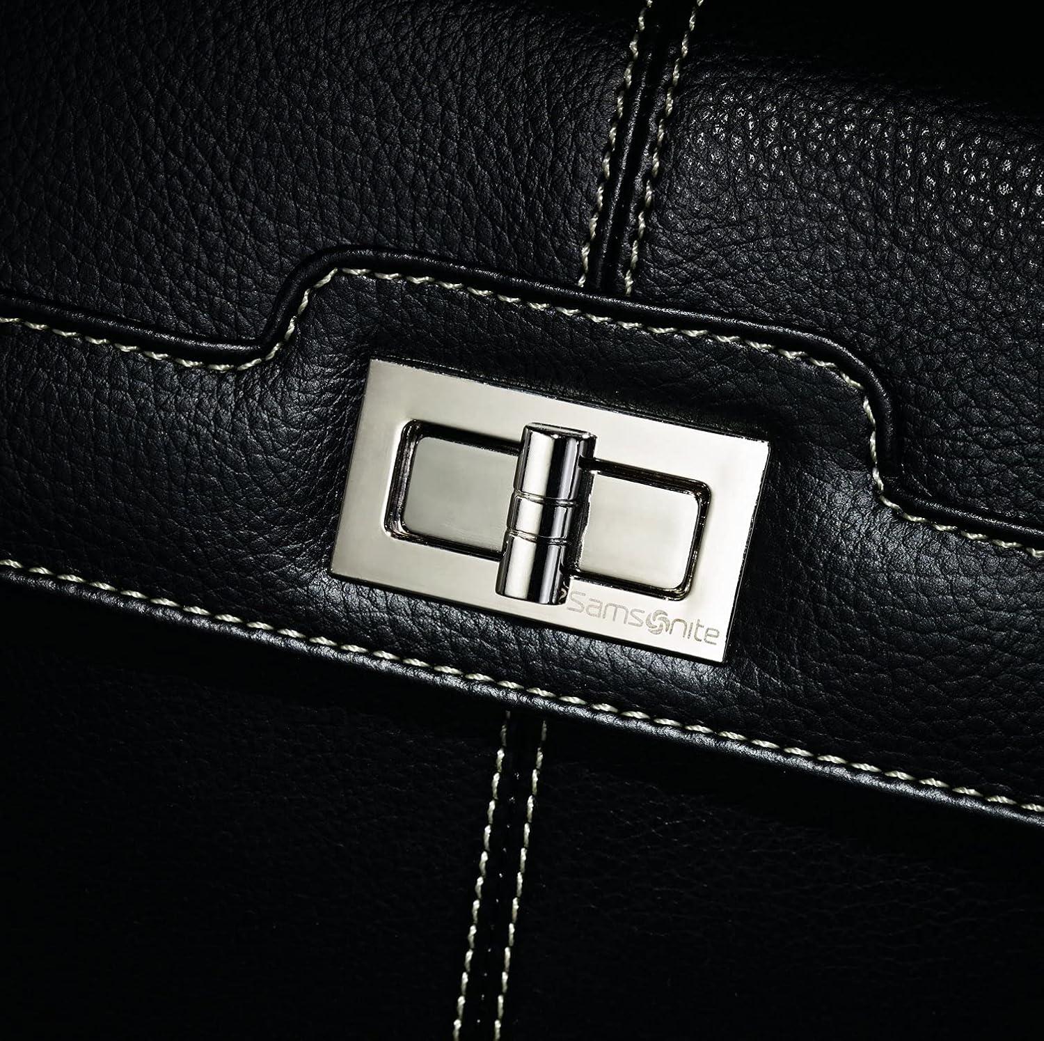 Carry your laptop and other essentials for the daily commute or business travel inside this chic mobile office from Samsonite. The Samsonite Women's Laptop Mobile Office is made from faux leather and features a sleek and stylish design with contrast accent stitching, two top handles for hand toting, a retractable pull handle, and smooth rolling wheels for easy mobility. This laptop case has a dual compartment design with a padded laptop pocket, a rear compartment to hold files and documents, and slip pockets to hold accessories. A separate front organizer compartment includes a pocket for your iPad or table, pen sleeves, and slip pockets to hold small personal items.
