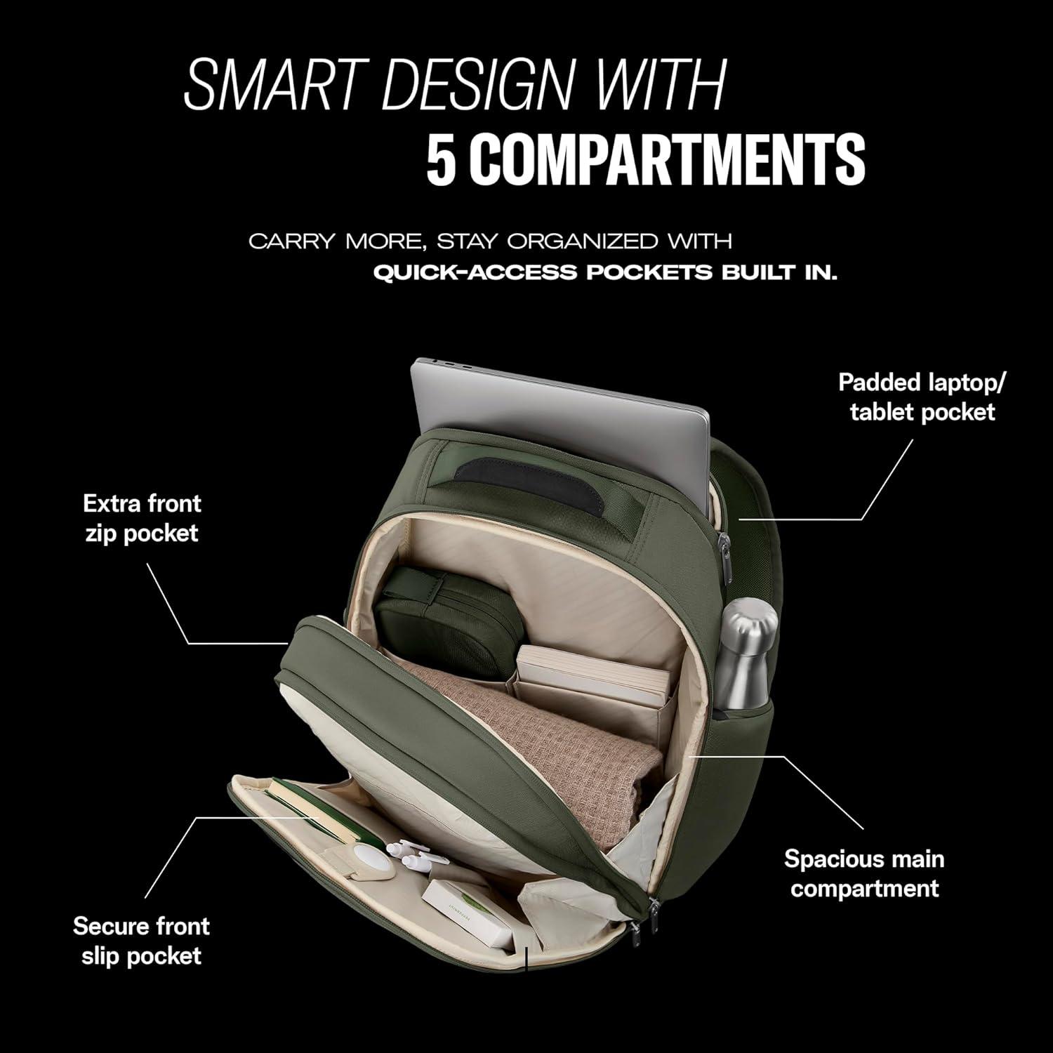 FIVE-COMPARTMENT ORGANIZATION – Stay organized with a secure front slip pocket, spacious main compartment, dedicated laptop/tablet sleeve, separate file compartment with built-in organizers, and dual side pockets for water bottles or umbrellas