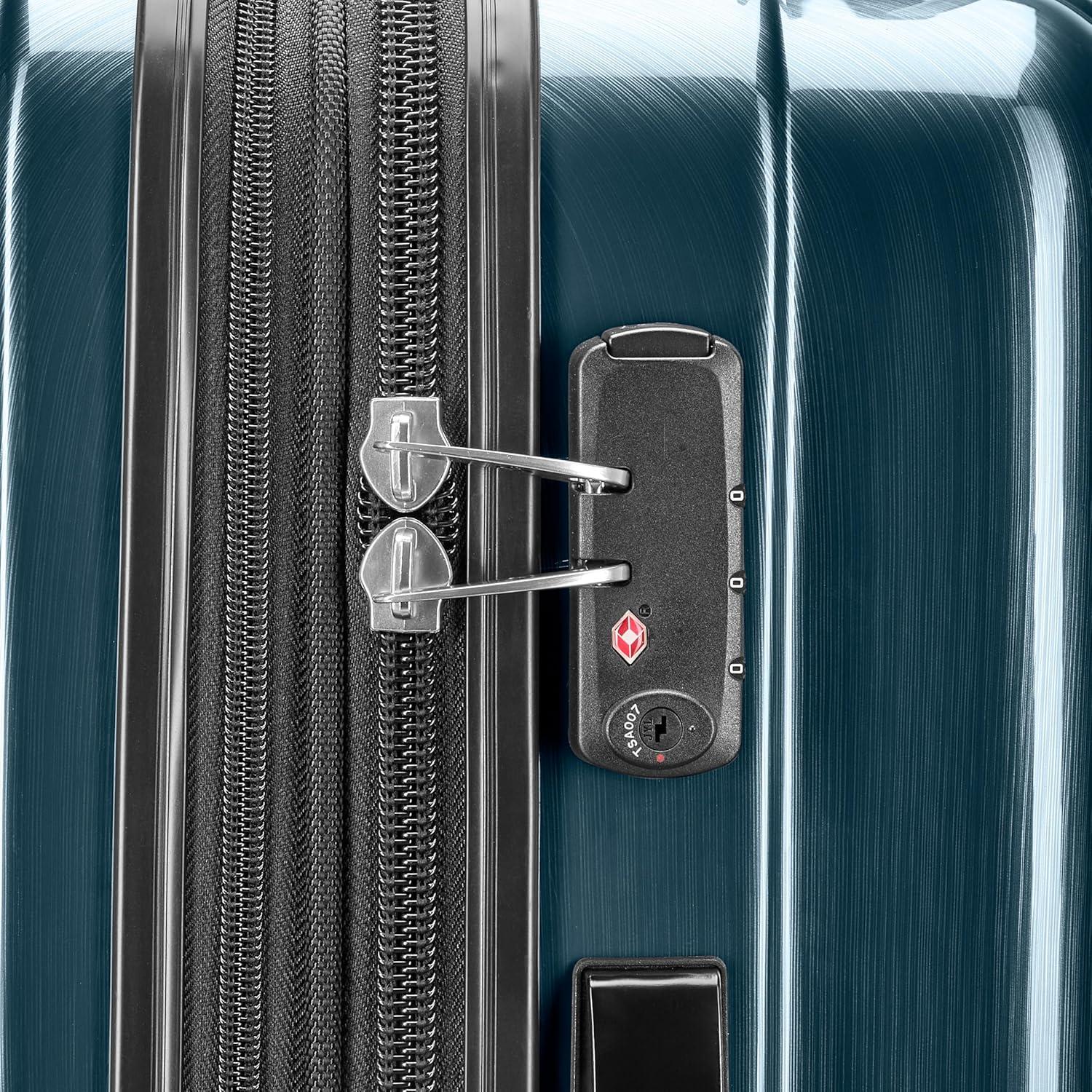 Transport your travel essentials effortlessly and stylishly. This extremely lightweight and durable spinner features 100 percentage polycarbonate construction with sharp molded details. Made to absorb impact by flexing while under stress then popping back to its original shape, eliminating dents and dings while protecting its contents. An elegant brushed pattern hides any potential scratches or scuffs from your journeys. The fully-lined interior has cross-straps, a privacy curtain with its own zippered organizational pockets. Tsa approved combination lock for security and peace of mind. Beautiful brush-stroke coloration which is great for hiding any potential scratches or scuffs from your journeys.